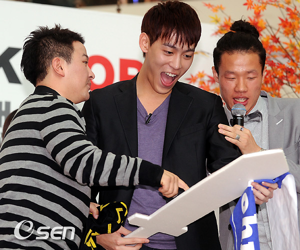 존박이 쳐밀도라고 적혀 있는 피켓을 보고 놀라고 있다. /soul1014@osen.co.kr