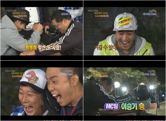 그러나 막상 대결이 시작되자 이승기와 이수근 매니저는 막상막하의 접전을 펼쳐 현장을 놀라게 했다. 보기보다 팔 힘이 센 이승기는 악착같은 괴력을 발휘, 결국 이수근 매니저를 눕히고 승리를 따냈다. 예상치 못한 승리에 현장의 스태프와 멤버들은 광분했다.