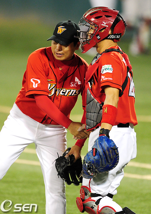 경기후 SK 이승호와 박경완이 악수를 하며 승리를 기뻐하고 있다. /jpnews@osen.co.kr
