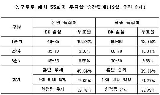 스포츠토토 공식 온라인 발매사이트인 베트맨(www.betman.co.kr)은 오는 20일 오후 7시에 잠실학생체육관에서 벌어지는 2010-2011 프로농구 SK-삼성전을 대상으로 한 농구토토 매치 55회차 투표율 중간집계 결과 전체 참가자의 39.36%가 홈팀 SK의 승리를 예상했다고 밝혔다.