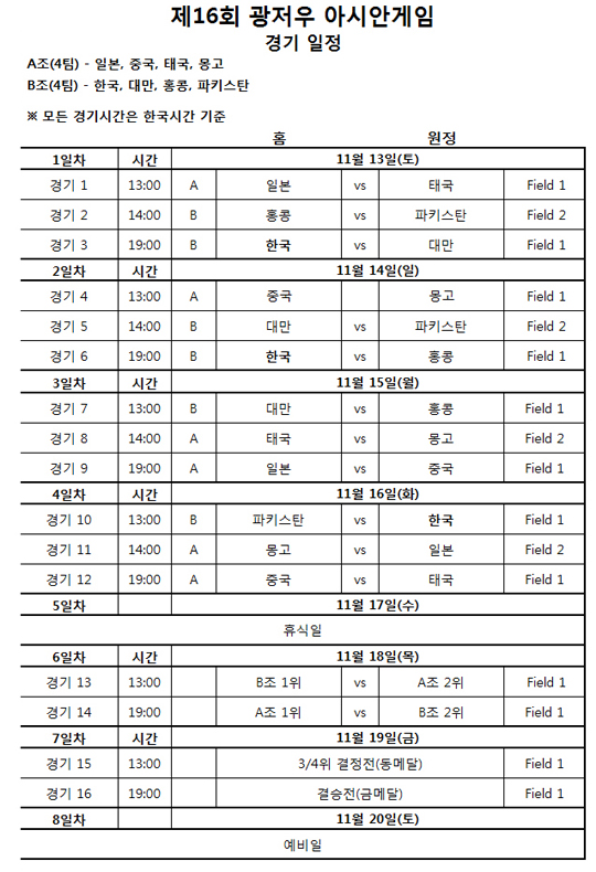 한국은 다음날인 14일 홍콩전, 하루 휴식 후 16일 파키스탄전을 하게 된다. 대회 5일 째인 17일은 우천 대비 휴식일이다. 각 조별 1, 2위팀은 18일 크로스로 준결승전을 한 후 19일 결승전(20일은 예비일)에서 금메달을 다투게 된다.