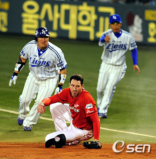 2회말 무사 최형우의 1루수 옆을 뚫은 타구를 SK 정근우가 극단적인 시프트 수비로 잘 잡았지만 악송구를 범하자 글로버가 아쉬워 하고 있다. /spjj@osen.co.kr
