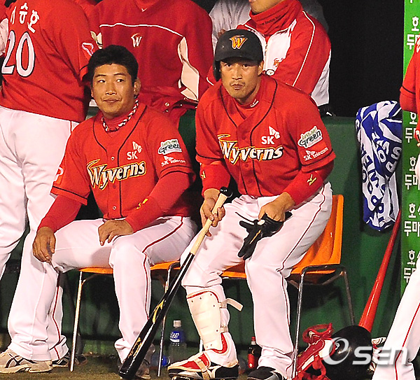 8회초 마지막 타석이 될수 있는 상황에서 김재현이 안치용과 교체되어 아쉬운 표정으로 덕아웃에 앉고 있다. /spjj@osen.co.kr
