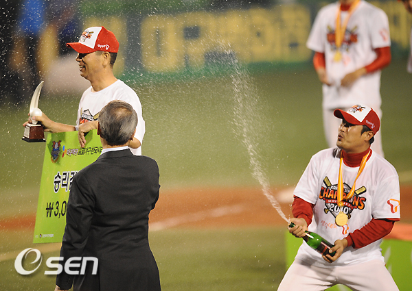 경기 종료후 시상대에서 승리 감독상을 수상한 김성근 감독이 이호준으로 부터 샴페인 세례를 받고 있다./ ajyoung@osen.co.kr