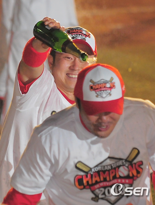 경기 종료후 박경완이 이호준에게 샴페인 세례를 퍼붓고 있다./ ajyoung@osen.co.kr