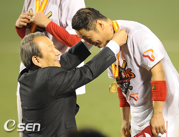 경기 종료후 시상식에서 유영구 총재가 박경완에게 우승 메달을 걸어주고 있다./ ajyoung@osen.co.kr