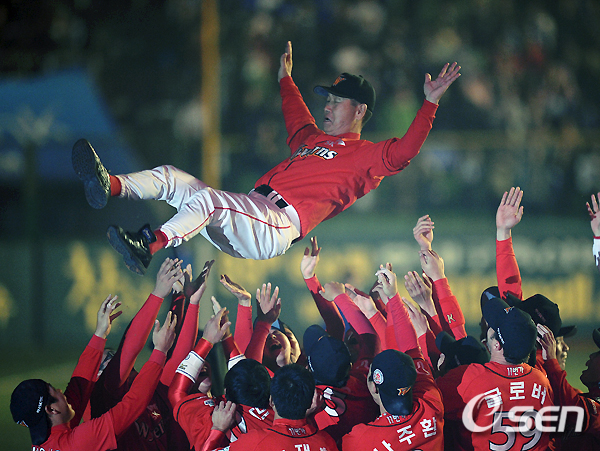 SK는 19일 대구구장에서 벌어진 삼성과의 한국시리즈 4차전서 4-2로 승리하며 시리즈 전적 4승 무패로 2년 만에 통합우승에 성공했다. 2007년 감독으로서 첫 한국시리즈 우승에 성공하며 진짜 명장 반열에 등극한 김 감독으로는 개인 3번째 한국시리즈 우승.