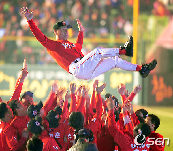 김 감독은 19일 대구구장에서 열린 삼성과의 한국시리즈 4차전에서 4-2로 승리, 2007년과 2008년에 이어 세 번째 우승 감격을 누렸다.