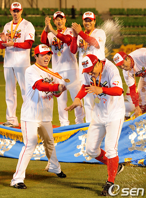 SK 박정권이 한국시리즈 MVP로 발표되자 동료선수들의 샴페인 세레를 받고 있다. /jpnews@osen.co.kr