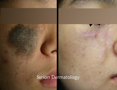 최근에는 레이저 박피 제거술 및 Q 색소 레이저의 병용요법 또한 절제가 어려운 모반에 시행할만한 치료법이다. 단순한 Q 레이저 반복 시술은 효과도 적을 뿐 아니라 악성 흑색종으로 변화 가능성 등도 논란이 될 수 있다. 레이저 박피 제거 및 Q 색소 레이저의 병용요법은 수술 후 흉터도 없애는 일석이조 방법이다. 최소 반흔과 빠른 상처 복원을 위해 피부 배양 이식이 큰 도움이 될 수 있다.