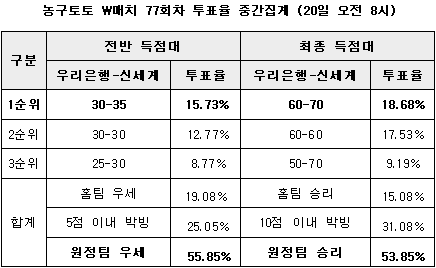 2010-2011 시즌 농구토토 W매치 77회차 투표율 중간집계 결과. 신세계, 우리은행에 승리 전망…최종 득점대 60-70점대 신세계 우세 18.68% 최다