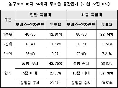 득점대 투표율을 살펴보면 전반 득점대에서는 40-35점대 모비스 리드가 12.81%로 1순위를 차지했고, 최종 득점대에서는 80-80점대 박빙의 승부가 22.74%로 최다를 기록했다.