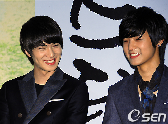 기자회견중 씨엔블루의 이종현과 강민혁이 얘기를 나누며 환하게 웃고 있다./rumi@osen.co.kr