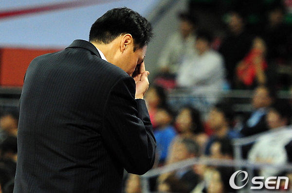 4쿼터 삼성 안준호 감독이 패배가 확정적이자 땀을 닦으며 고개를 떨구고 있다. /jpnews@osen.co.kr