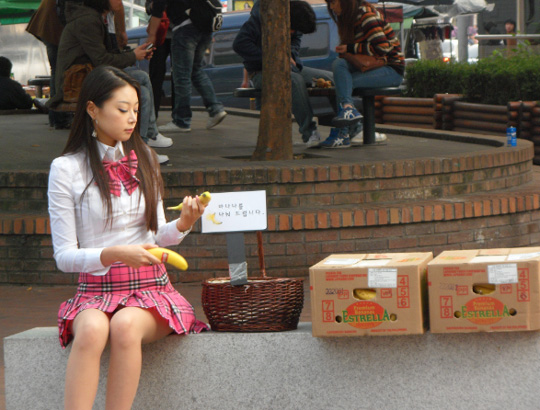 얼마전 홍대 앞에 트럭을 세워놓고 달걀을 나눠주던 민소매 티셔츠 차림의 '계란녀'가 눈길을 끌더니 이번에는 바나나를 박스로 쌓아놓고 나눠주는 미모의 '바나나녀'까지 등장했다.