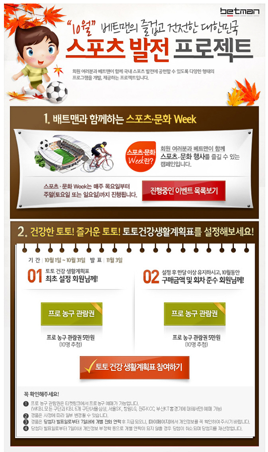 <사진> 베트맨에서 10월 한달 실시하고 있는 베트맨의 즐겁고 건전한 대한민국 '스포츠발전 프로젝트' 이벤트 페이지/스포츠토토 제공.