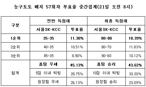 스포츠토토 공식 온라인 발매사이트인 베트맨(www.betman.co.kr)은 오는 22일 오후 7시에 잠실학생체육관에서 벌어지는 2010-2011시즌 프로농구 서울SK-KCC전을 대상으로 한 농구토토 매치 57회차 투표율 중간집계 결과 전체 참가자의 43.62%가 홈팀 SK의 승리를 예상했다고 밝혔다.