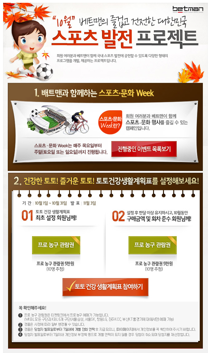 <사진> 베트맨에서 10월 한달 실시하고 있는 베트맨의 즐겁고 건전한 대한민국 '스포츠발전 프로젝트' 이벤트 페이지/스포츠 토토 제공.
