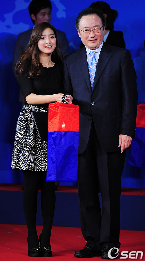 무대 위에서 김소은이 사공일 G20 정상회의 준비위원회 위원장과 함께 위촉장과 청사초롱을 들고 포즈를 취하고 있다./rumi@osen.co.kr