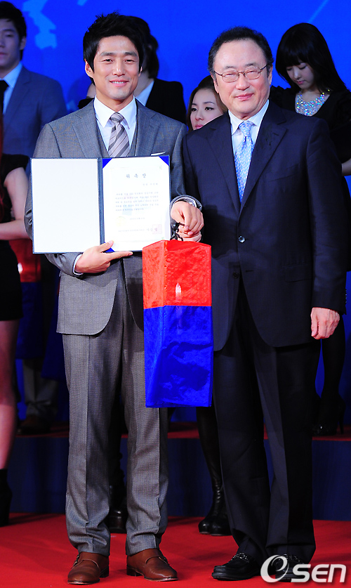 무대 위에서 지진희가 사공일 G20 정상회의 준비위원회 위원장과 함께 위촉장과 청사초롱을 들고 포즈를 취하고 있다./rumi@osen.co.kr