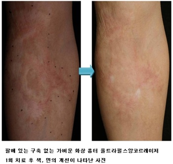 이런 상황에서, 치료기간이 짧고 비교적 가벼운 화상흉터를 손쉽게 해결할 수 있는 치료법이 관심을 모으고 있다. ‘뉴울트라펄스 앙코르 레이저’를 활용한 화상흉터 치료법은 피부표면에 작용해 흉터를 개선하는 방법이다. 피부에 수 만개의 점을 찍는 것처럼 레이저가 작용, 그 주위에 남아 있는 정상피부가 새 살을 돋게 하는 원리의 ‘프락셔널’ 방식이다. 이 기술을 사용하면 레이저 치료를 한 화상흉터 주위에 정상피부에서 새살이 빨리 돋아나기 때문에 치료 후 부작용이 적고 회복이 빨라 일상생활에 큰 지장 없이 치료할 수 있는 것이 장점이다. 그만큼 치료가 빨라진다.