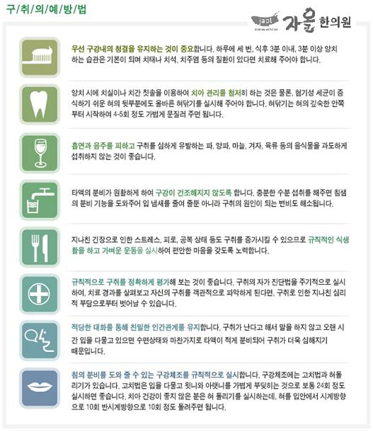 남무길 원장은 “이외에도 오장의 열증에 따라 각각 입맛과 입 냄새가 다르게 나타난다고 전한다.”며 “또한 진액은 우리 몸을 구성하는 액체상태의 물질로 침의 부족이 구취의 원인인 경우가 많으므로 침의 분비가 제대로 되는지 확인해야 한다.”고 강조했다.