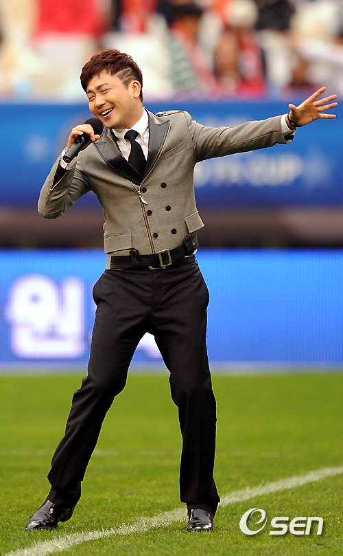 24일 오후 부산 아시아드주경기장에서 열린 '2010 하나은행 FA컵' 결승전 부산 아이파크와 수원 삼성의 경기 전 가수 박현빈이 축하공연을 펼치고 있다.