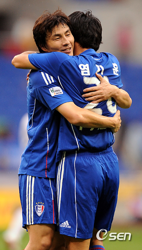 24일 오후 부산 아시아드주경기장에서 열린 '2010 하나은행 FA컵' 결승전 부산 아이파크와 수원 삼성의 경기 전반 수원 염기훈이 선취골을 넣자 수원 리웨이펑과 포옹을 하고 있다.