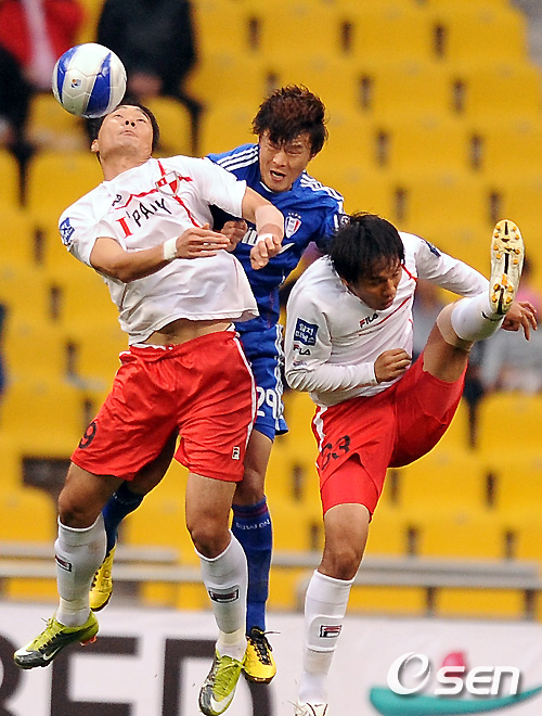 24일 오후 부산 아시아드주경기장에서 열린 '2010 하나은행 FA컵' 결승전 부산 아이파크와 수원 삼성의 경기 전반 수원 곽희주가 부산 정성훈과 공중볼을 다투고 있다.