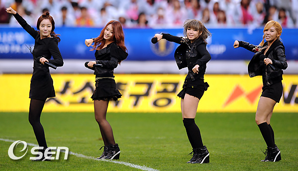 24일 오후 부산 아시아드주경기장에서 열린 '2010 하나은행 FA컵' 결승전 부산 아이파크와 수원 삼성의 경기 하프타임때 그룹 시크릿이 축하공연을 펼치고 있다.