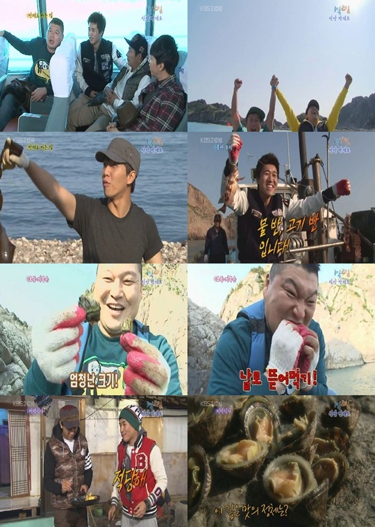 만재도에 도착한 멤버들은 각자 주어진 해양생물들을 채취하기 위해 각자 정해진 곳으로 향했다. 게임에서 1등한 이수근과 2등을 차지한 이승기는 비교적 쉬운 고구마 캐기와 다시마 말리기에 나섰다. 은지원은 배말캐기, 강호동은 거북손 캐기에 나섰다. 김종민은 우럭 낚시를 위해 배에 내리자 마자 배에 올랐다.