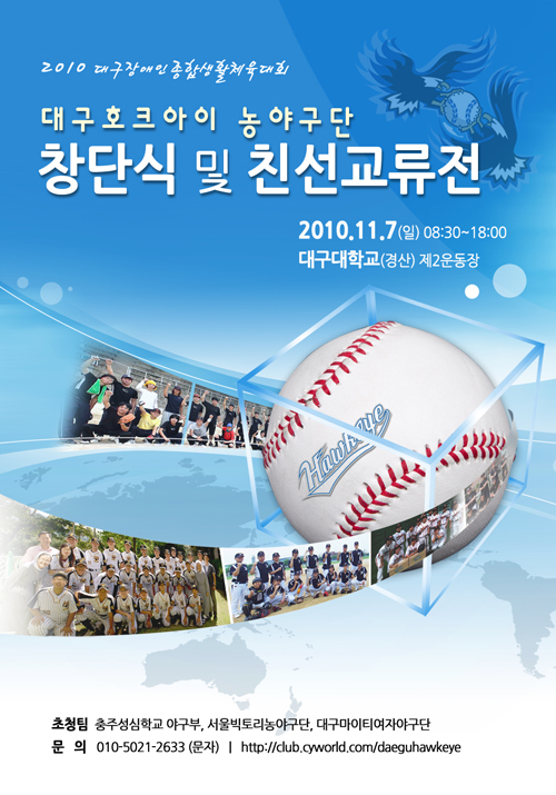 대구경북지역 최초 장애인 야구단이 창단한다. 대구영화학교 및 대구대학교 출신 장애인으로 구성된 대구호크아이 농아인 야구단이 내달 7일 오전 8시 30분부터 대구대 진량캠퍼스 제2운동장에서 창단식을 갖고 충주성심학교, 서울빅토리농야구단, 대구마이티여자야구단과 친선교류전을 치른다. 이진호 감독을 비롯한 15명의 선수들이 그라운드 위에서 투지를 불태울 각오.