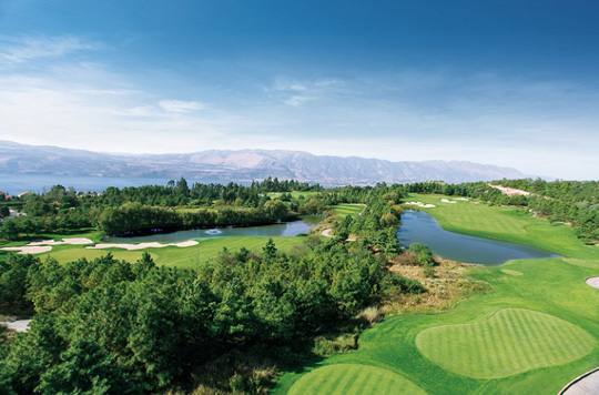 9번홀(PAR5): 페어웨이가 좁고 거리가 비교적 짧으며 왼쪽은 언덕과 바위, 오른쪽은 호수로 구성돼 있어 그린까지 세컨드 샷으로 쉽게 올라갈 수 있지만 호수에 둘러싸여 있어 고도의 정확성이 필요하다.