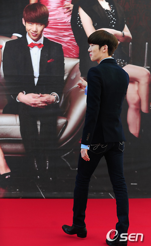 조권이 자신의 표정이 재미있게 나온 백드롭을 가리키며 웃고 있다. /spjj@osen.co.kr