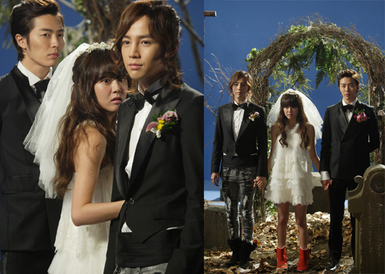 스키니진에 부츠, 체인으로 포인트를 준 보헤미안 왕자님 장근석과 깔끔한 턱시도 차림에 뒤로 넘긴 머리가 시크 함까지 엿보이는 김재욱, 무릎 위로 올라오는 미니 웨딩드레스 차림의 문근영이 시선을 모은다.