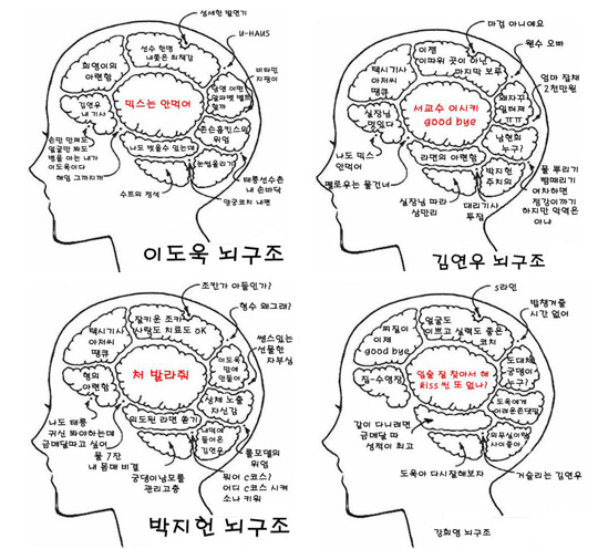 김소연의 경우 ‘서교수 이시키 good bye’가 뇌의 가운데에 자리잡은데 ‘마검 아니예요’‘엄마 잡채 2천만원’‘실장님 멋있다’ 등으로 눈길을 모은바 있다.