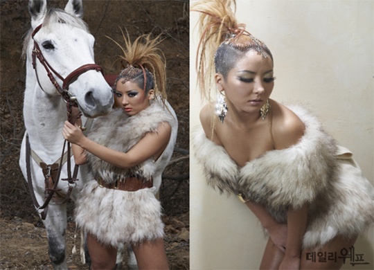 메이크업은 그레시한 섹시함을 강조했고, 우아한 흰 백색의 모피, 그리고 백마의 멋스러움으로 이미지 조화를 이뤄, 도시의 노블한 여인의 에너지 넘치는 모습을 선보였다.