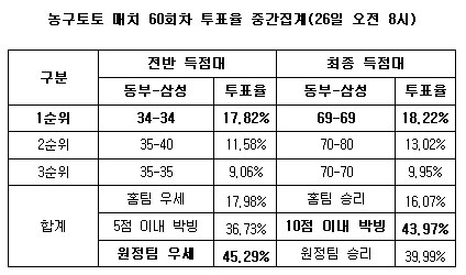 체육진흥투표권 수탁사업자인 오리온그룹 계열의 스포츠토토㈜(www.sportstoto.co.kr)는 26일 오후 7시에 원주치악체육관에서 벌어지는 2010~2011시즌 프로농구(KBL) 동부-삼성전을 대상으로 한 농구토토 매치 60회차 투표율 중간집계 결과 전체 참가자의 43.97%가 양팀이 10점차 이내 승부를 벌일 것으로 예상했다고 밝혔다.