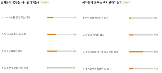 이외에 야성미가 물씬 풍기는 팔뚝근육에 핏줄이 선 남자와 치골이 섹시한 남자가 17%로 공동 2위를 차지하는 등 1위와는 정반대로 짐승남을 향한 섹시 판타지 역시 높은 순위에 올랐다.