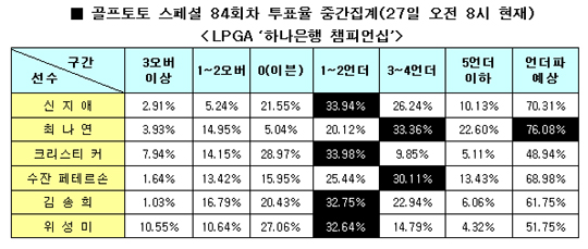 '골프지존' 신지애가 70.31%로 2순위를 차지했고 수잔 페테르손, 김송희, 위성미가 각각 68.98%, 61.75%, 51.75%로 뒤를 이었다. 3번 선수로 지정된 크리스티 커는 48.94%를 기록해 부진한 모습을 보일 것으로 전망했다.