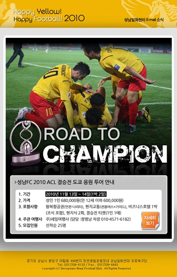 성남은 오는 11월13일 오후 7시 도쿄 국립경기장에서 열리는 2010년 아시아 챔피언스리그 결승전 응원 투어 ‘로드 투 챔피언(Road To Champion)’를 기획해 27일부터 참가자를 모집한다.