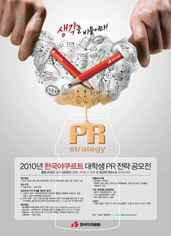 2010년 한국야쿠르트 대학생 PR전략 공모전은 기업PR부문과 마케팅PR부문 중 1개 주제를 택하여 참가할 수 있으며 전국 2년제 이상 대학생이면 누구나 참가 가능하다. 1개 팀은 4명 이하로 구성돼야 하며 팀당 응모작품수는 1개로 제한된다.