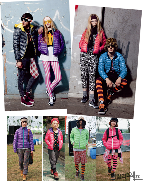 패딩점퍼의 무겁고 칙칙한 느낌에서 비비드한 컬러의 조화로 스타일리시하게 연출할 수 있는 것. 액세서리나 다른 아이템과의 과감한 매치를 활용해보자.