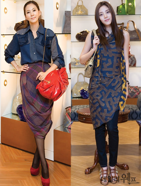 싱글보다 화려한 미시 김남주는 따뜻한 색감의 핑크와 바이올렛 체크스커트로 패셔너블하게, 손담비도 유니크한 기하학 프린트 원피스로 시크하게 비비안웨스트우드 의상을 차려 입었다.