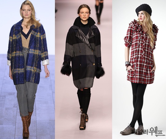 또한, 스포트막스는 블루나 블랙계열로 큼직한 체크를 스포티하게 풀어냈다. 박시한 롱 아우터, 랩 원피스 등에 블랙과 블루 컬러 체크를 믹스한 패션 아이템을 등장시켰다. 여성들에게 매력적인 브랜드 쥬시꾸띄르는 러플장식 레드 체크드레스와 레깅스를 매치해, 걸리시 체크 룩을 스타일리시하게 표현했다.