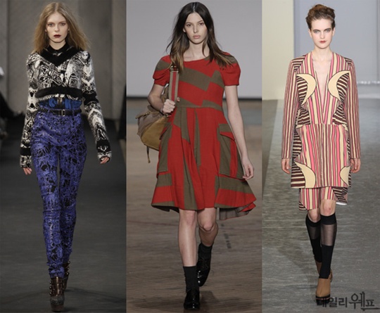 프로엔자슐러 컬렉션은 회화적 터치가 느껴지는 그래픽 패턴의 스웨터와 팬츠 룩을, 마크 바이 제이콥스 컬렉션은 굵은 스트라이프를 가로, 세로, 사선으로 다양하게 패턴을 늘어뜨려 모던한 감각을 뽐냈다.