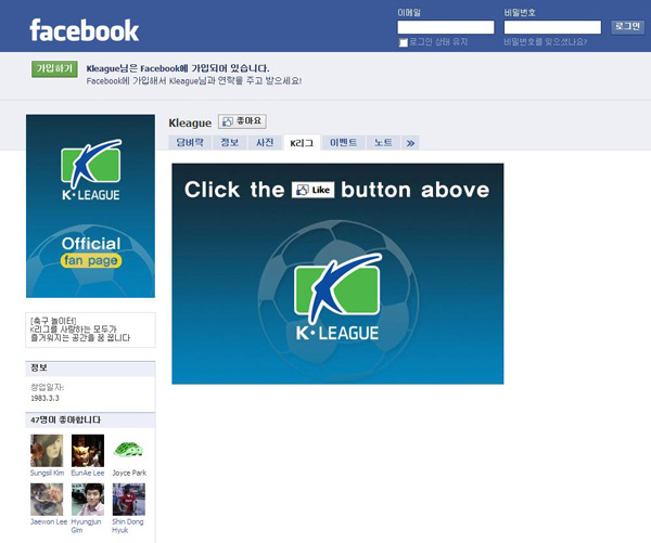 이번 페이스북은 K리그 홈페이지(www.kleague.com)와 지난 8월 개설한 K리그 공식 트위터(@kleague)에 이어 세 번째 K리그의 온라인 소통 창구다. 국내 4대 프로 스포츠 단체(프로축구, 프로야구, 프로농구, 프로배구) 가운데 처음이다. '페이스북(www.facebook.com)'은 세계 최대 소셜 네트워크 서비스(SNS)로 이용자가 5억여 명에 달한다.