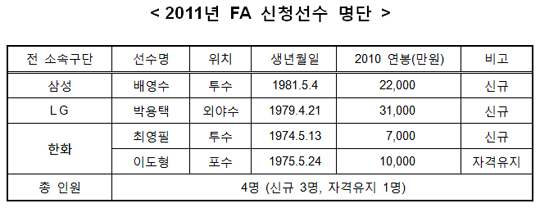 KBO에 따르면 2011년 FA 신청선수는 기존 소속구단 기준으로 삼성 배영수, LG 박용택, 한화 이도형, 최영필 총 4명이다.