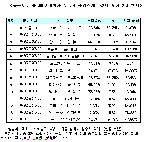 2010-2011시즌 농구토토 승5패 9회차 투표율 중간 집계 결과…마감 29일 18시 50분