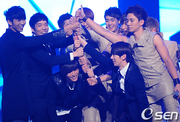 'I'll be back'으로 1위를 차지한 2PM이 2AM과 엄지손가락을 맞대고 있다. /jpnews@osen.co.kr